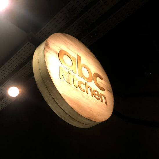 Изготавливается из композитных панелей с фрезерованными отверстиями, в которые вставляются элементы из оргстекла. Подсветка — двусторонняя.