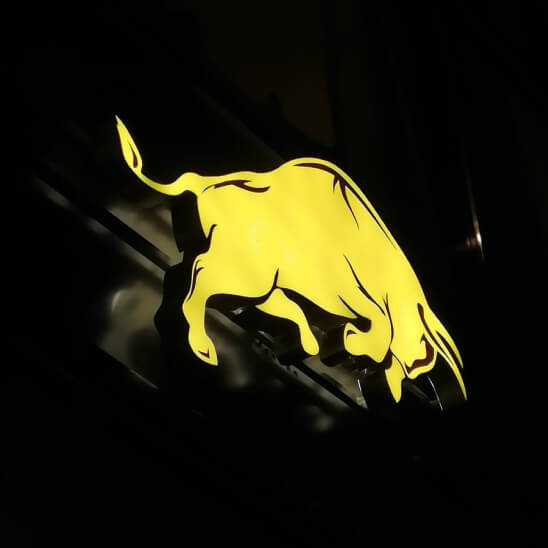 Объёмный световой короб с фигурным резом можно изготовить практически любой формы. В виде фигурного короба можно сделать как элемент вывески, так и лицевую надпись целиком. Иногда так делают в целях экономии, а иногда по задумке дизайнера.