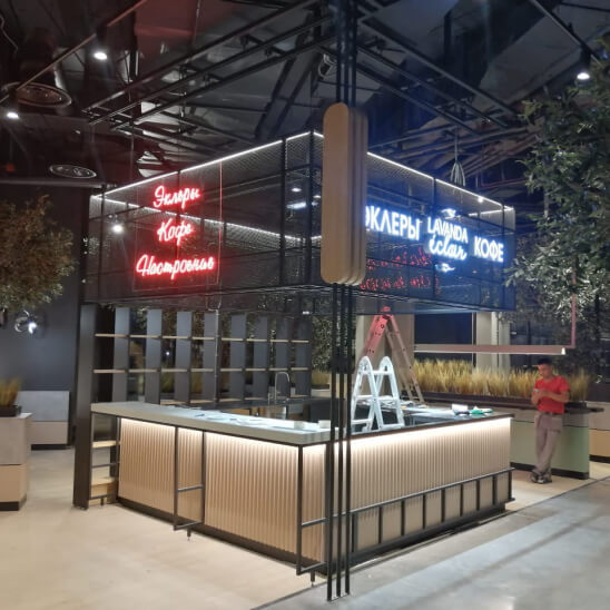 Уникальные проекты со сложной геометрией, специальными материалами и оригинальной подсветкой. Ориентированы на премиальные бренды и архитектурные объекты с индивидуальным дизайном. Часто включают в себя элементы ручной работы и сложные инженерные решения.
