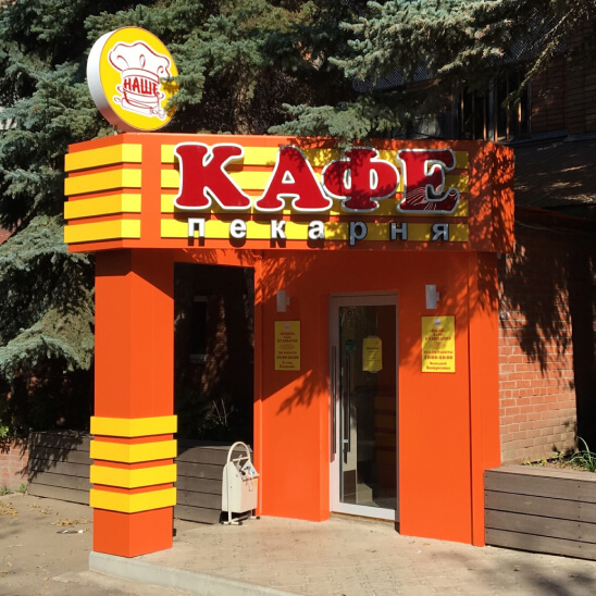 Комплексная или фрагментарная отделка фасадной области вокруг входа для формирования целостного фирменного стиля. Рекомендована для крупных объектов: торговых комплексов, гостиниц и ресторанов. Позволяет комбинировать различные материалы и системы освещения.