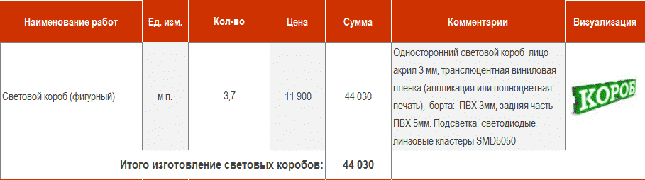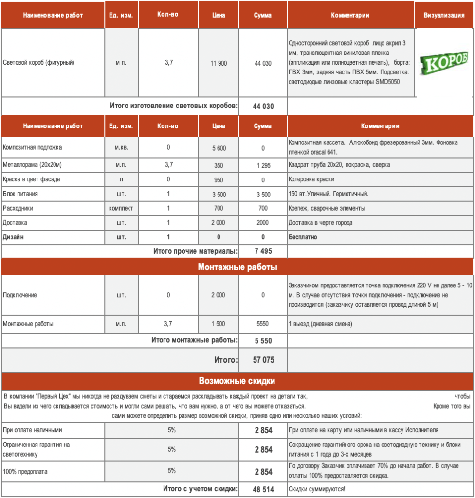 Вычеркиваем из сметы, на чем можно сэкономить — получаем световой короб за 48 514 рублей.